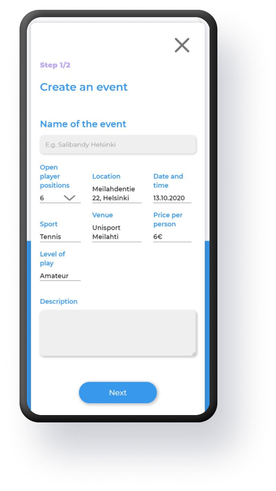 On the home page users see the events based on their sport preferences. If preferences have not been chosen the events shown first will be based on the events geographical proximity to the user. On the top right corner there three clickable elements: create-an-event button, sign-out button and setting menu. Both the create-an-event button and the settings menu open a pop-up window. We wanted to have as much of the functionalities on a single page and pop-windows serves this purpose well.
