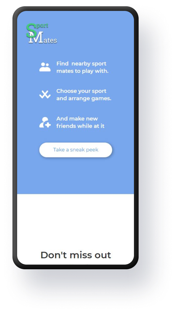 Navigation is done using buttons on the landing page and on the main page. On the landing page users have the ability to take a sneak peek (using the “sneak peek” button) of the main page but won’t be able to create or join events. Moreover, the landing page has the standard register and sign in buttons. The objective of the landing page is to quickly provide users an overview of the website and get them to register or sign-in to the website as quickly as possible. The sneak peek functionality is a great way of easing users into the website without them needing to register first. If they liked the website they might opt to register.