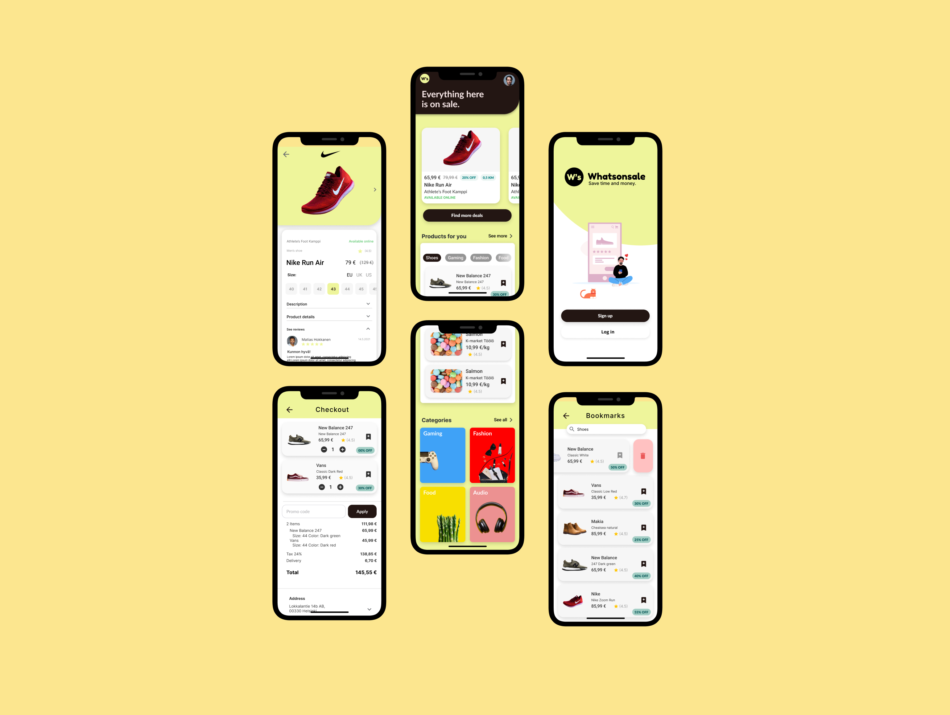 Next, I started to create somewhat high fidelity frames for the app to get a sense of its visual identity and layout options. I took inspiration from Youtube's UI and Wolt's UI as they both had specific elements that fit my app. Youtube desktop viewport uses filtering bar where is has different points of interest layout in a row which makes easy for users to filter large amount of products to find something that would likely interests them. I added a similar filtering system to my app as well as it decreases the amount clicks/taps the user has to make in order to search something. I took inspiration of Wolt's card UI with its rounded corners to give the app a more friendly appearance.